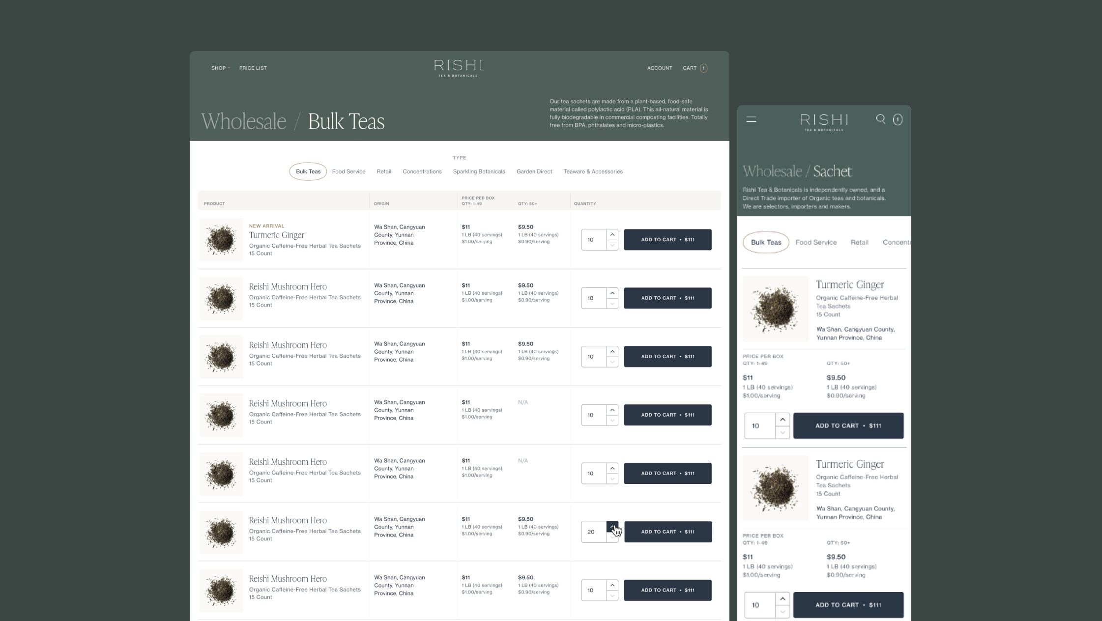Leveraging the power of Shopify Plus, we designed and built a unique shopping experience directed towards Rishi’s wholesale customer. Taking into consideration bulk purchasing, a B2B customer is able to log in and view bespoke product catalog and pricing information — easily managed within the Shopify backend.