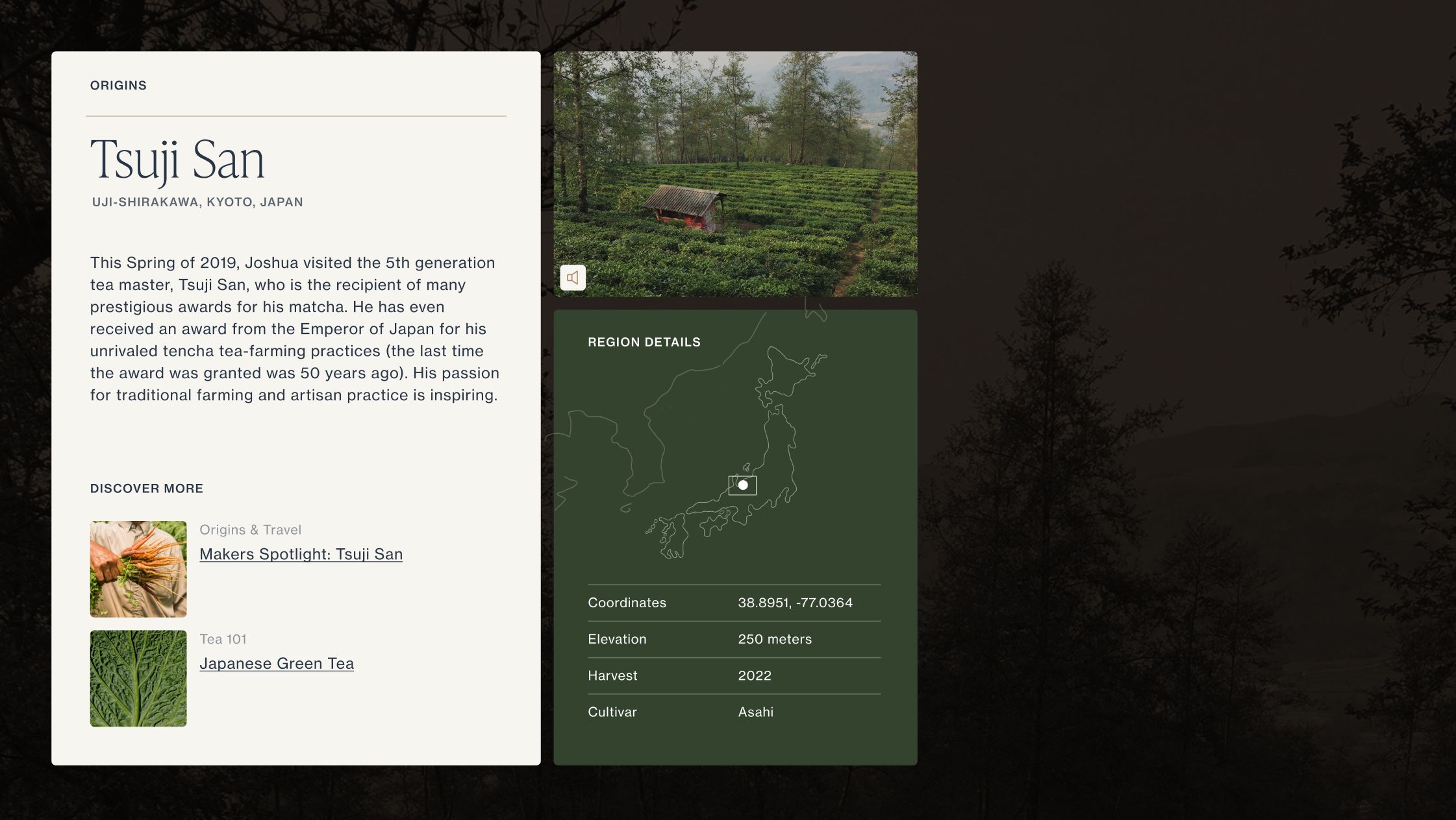 Since 1997, founder Joshua Kaiser has been traveling the globe, sourcing the best possible producers of tea. We wanted to celebrate the global scale of Rishi by building a custom product discovery, education, and shopping experience powered by Mapbox.